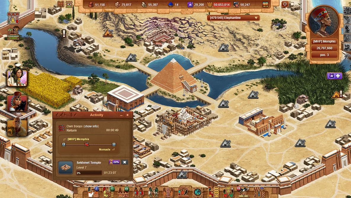 La tâche en la matière ne sera pas simple car vous devrez vous montrer un bâtisseur avisé. Construisez au moment opportun des pyramides, des fermes à blé, des entrepôts, des bibliothèques, des temples, des Sphinx et aussi des villas tout en gardant un œil sur vos plantations de payrus et vos carrières d’extraction de roches.
